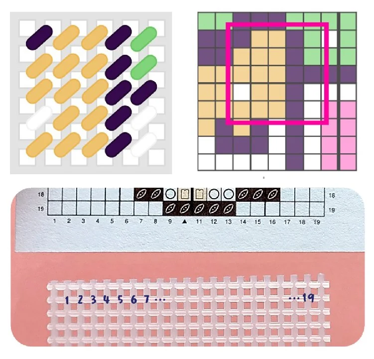 - Chaque carré sur le diagramme représente un demi-point, qui passera donc par deux trous de la toile. Dans le schéma ci-contre, la toile a été brodée en suivant la partie encadrée en rose