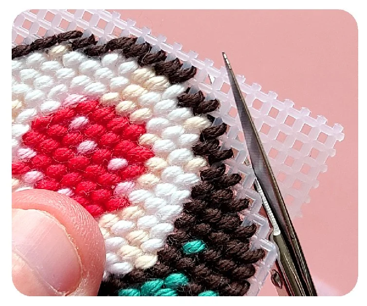- Une fois la broderie achevée, découpez les bords du canevas en prenant soin d’éviter les trous où passent les fils. Et pour un rendu bien lisse, vous pouvez également découper les petits picots restants sur les bords.
