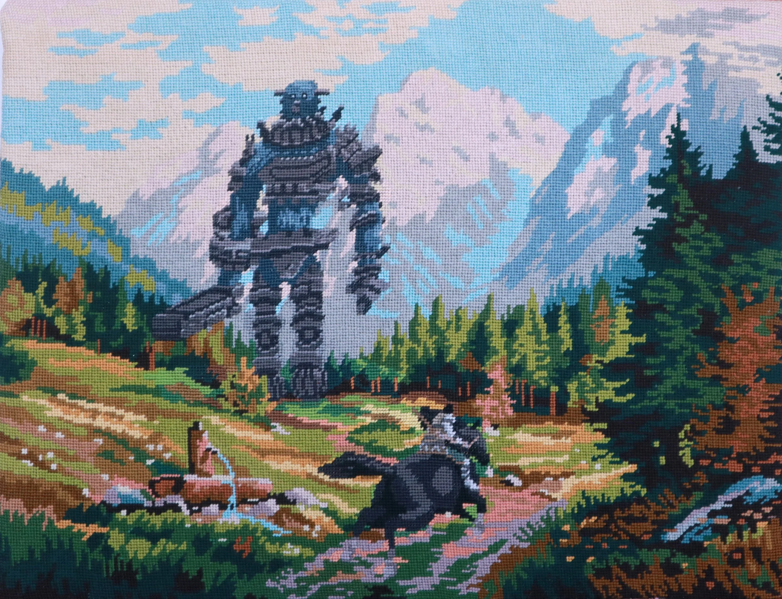If you are interested in a special commissionned tapestry featuring your favourite game, it is something Gauvain Manhattan can realise. However there are some conditions that you need to be aware of first. The artist only reinterprets classic videogames (no animes, comics, movies …). Not all games would fit nicely in an old forest or a large mountain landscape so if your game is off topic, the project will be kindly declined. For the budget, the price can vary a lot depending on the size of the canevas, the amount of added elements, the shipping location … so an estimation will be made after figuring out the final composition. Then a 30% advance will be asked to seal the commission and to buy all the first materials. The rest of it will be asked at the end but before shipping the canevas. Stitching a canevas is a lot of work, it can take months till it is completely ready so you will have to be patient before hanging it to your wall. If you are okay with all these conditions, you can contact the artist and expose your idea at :