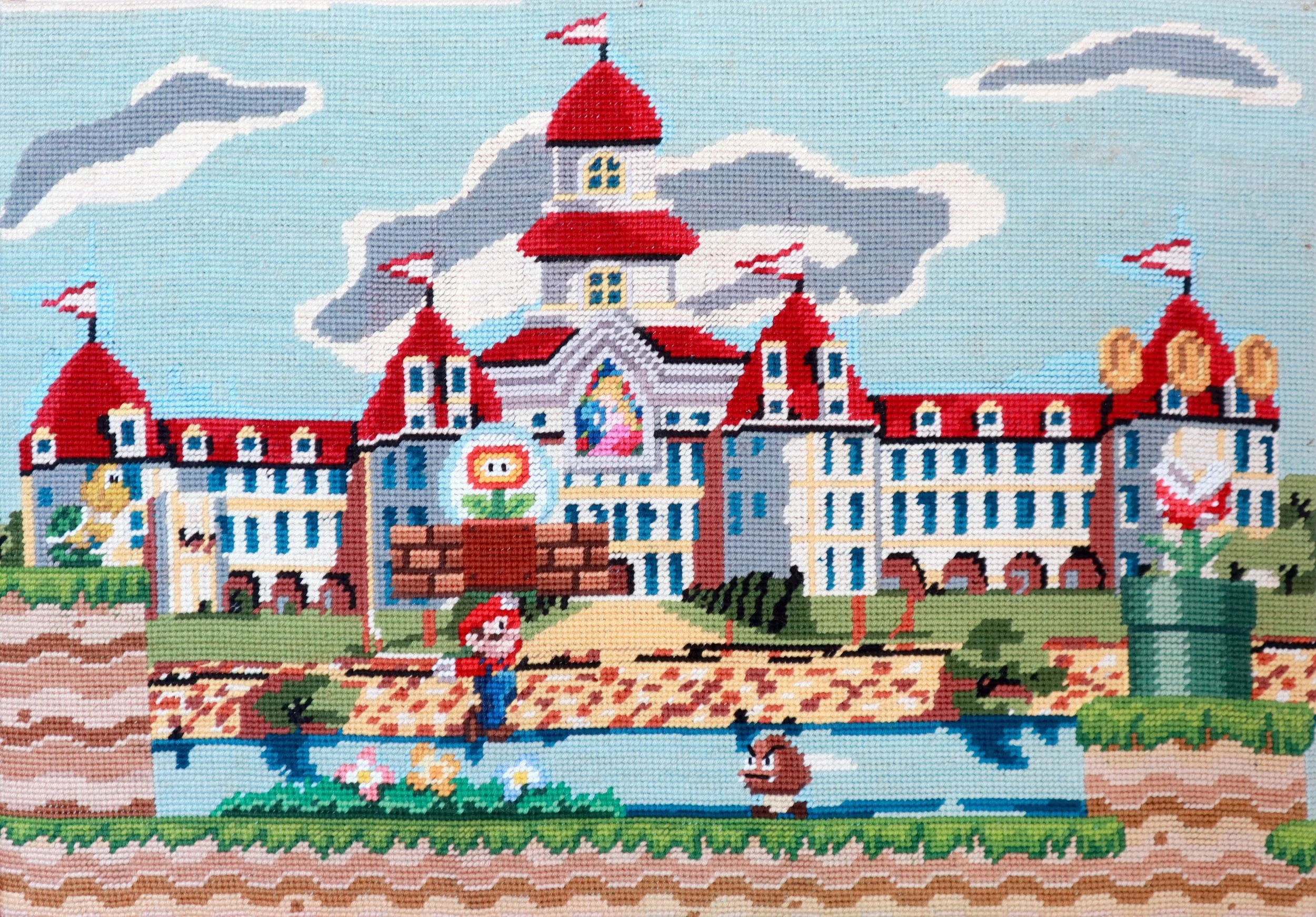 Gauvain Manhattan started this serie of videogames canevas in 2013 when he was studying art in Angoulême. The idea was to confront two very different images and intricate them to create an immersive mix in the same picture. The artist collects finished canevas in flea markets and creates a scenery with videogames sprites and references. When the composition is done, he restitches the different elements using needlepoint techniques and stretches the canevas in his previous frame. Old fashioned canevas and iconic videogames are not as opposite as they seem because they can cohabitate easily through these tapestries. The serie is still running and you can see all the pieces right below and their availablility.