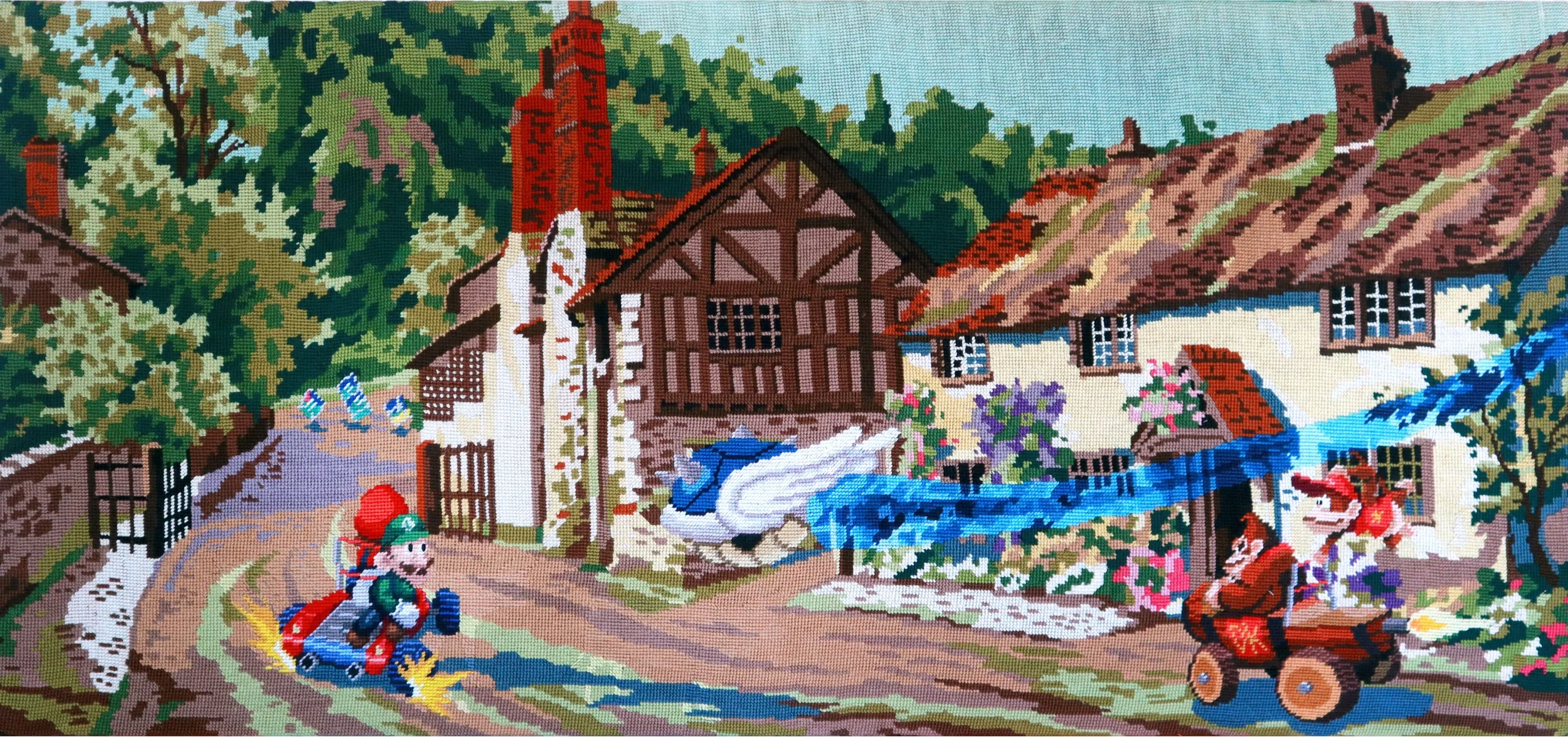 Gauvain Manhattan a démarré la série des canevas jeux vidéos en 2013 alors qu’il étudiait à Angoulême. L’idée était de confronter deux imaginaires traditionnellement très différents et de les réunir au sein d’une même œuvre. L’artiste récupère de vieux canevas en vide grenier où sur internet et détermine la scène agrémentée de références tirées de jeux vidéos. Quand la composition est faite, il débrode et rebrode les différents éléments en utilisant des techniques de demi point, puis retend la toile dans son cadre d’origine. Canevas kitschs et jeux vidéos icôniques ont bien plus en commun qu’on ne pourrait le croire quand on les voit aussi bien cohabiter au sein de ces tapisseries. Cette série est toujours en cours et vous pouvez en voir l’intégralité des pièces ci-dessous ainsi que leurs disponibilités.